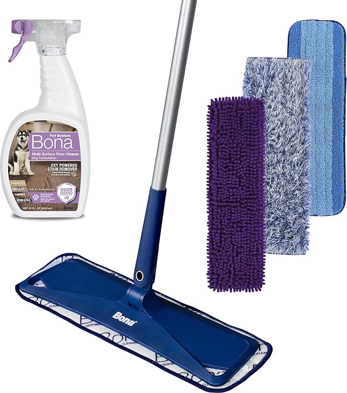 The Bona System Floor Cleaners have it covered with an enzymatic formula to clean and lift away stains and odors. Dog hair blanketing your floors? Put Bona’s specialized Pet System Microfiber Mop and Microfiber Sweeping Pad into action. Say goodbye to pet fur, hair, dander, and other household allergens from a brand that genuinely cares about you, your pets, and the planet. Choose from the multi-surface floor clear for dogs and cats, the premium microfiber mop for multi-surface floors, and the multi-surface sweeping pads.