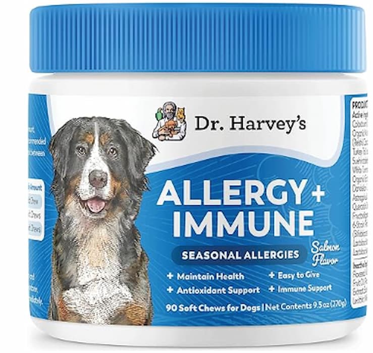 These soft chews are formulated by a company that has been manufacturing pet health and food products for more than 25 years. Dr. Harvey’s offers a salmon-flavored chew made with colostrum, an organic mushroom blend, white turmeric root, and a six-strain immunity probiotic blend. The results is a tasty supplement to help with seasonal allergy relief and provide canine immune support.