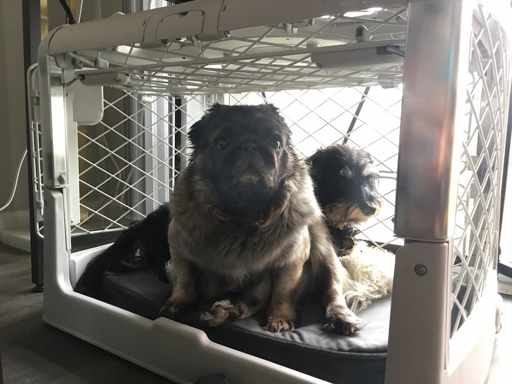 I’ve never had a dog who used a crate until now. My Aussie Shepherd service dog of 12 years would have done anything for me, but he wouldn’t voluntarily go into a crate. However, we recently adopted two pups who regularly spent time in crates before they joined our household. We wanted to keep them acclimated to a crate but help them form a more positive association with using one. Our Pekapug Miss Pearl had lived her previous life in a crate at an Asian meat market, and our Dachshund-mix Jean-Luc didn’t seem thrilled about crates. We quickly realized our old crate was not super comfortable or conducive for travel. So we wanted to give Miss Pearl and Jean-Luc a much-deserved upgrade and an overall good experience. Enter the Diggs Revol dog crate, an attractive, collapsible, modern alternative to traditional dog crates.