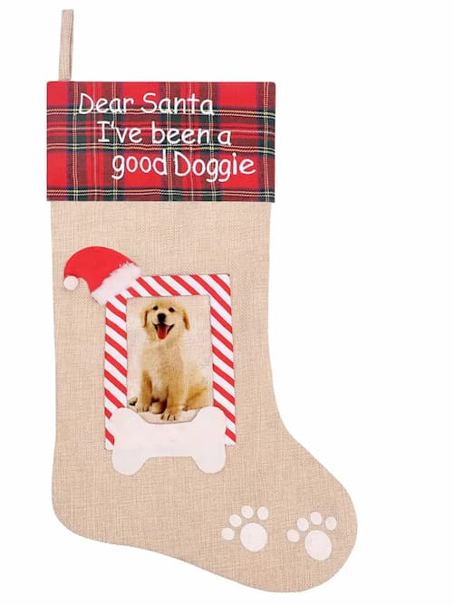 This festive holiday stocking is made of high-quality burlap and allows for one photo of your furry family member. Featuring red and green classic plaid cuffs, it is embroidered with, “Dear Santa I’ve been a good Doggle.” Ready to hang and stuff with your pup’s favorite items, this will look beautiful on a fireplace mantel or wherever your heart desires.