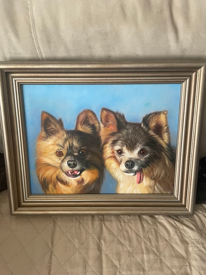 We ordered a painting of two of our dogs. One who passed away in 2023. We submitted two separate photos of each dog, and the artist painted the dogs side by side. There was some back and forth since we wanted a lighter blue background than what was originally sent to us. Overall, I was happy with what was sent to me. The painting is a beautiful visual reminder of my beautiful dogs. Plus, since my dog has passed, there are no other chances for me to have images of them side by side.
