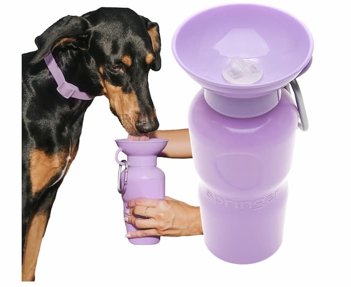 Springer offers this clever all-in-one solution for your dog’s hydration needs. The unit features a leak-tight shut-off valve so you can easily power cool, clean water into the attached bowl. You’ll never waste a drop, and your dog can stay hydrated on walks, hikes, and everyday adventures. Available in 15 ounce, 22 ounce, and 44 ounce sizes, choose the size and color that suits your pooch.